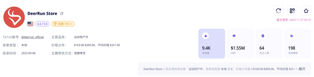 EchoTik数据发现:DeerRun 小店从11月入驻以来,总销量达到了9400,预估GMV达155万美元。
