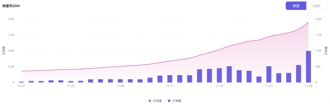 根据销量增长趋势可得知,小店的销量在黑五期间增长迅猛,特别是在11月中旬到现在。据EchoTik数据,小店2023-10-27的销量是23件商品,2023-11-25的销量是 995件, 增加了4226.09%。
