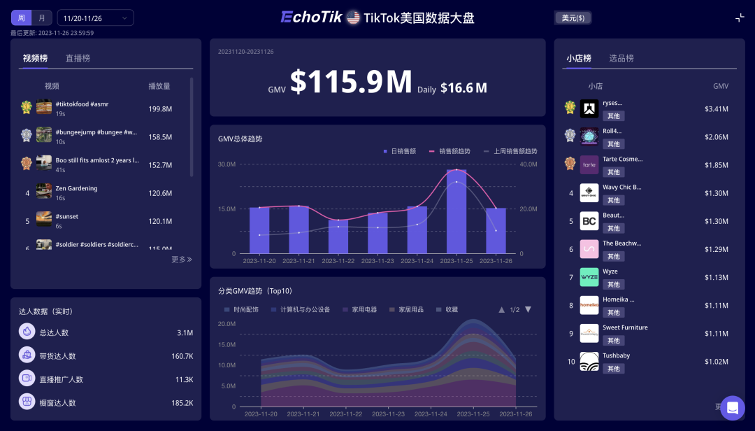 TikTok Shop美国电商数据周榜(11/20-26)已出,具体信息如下: