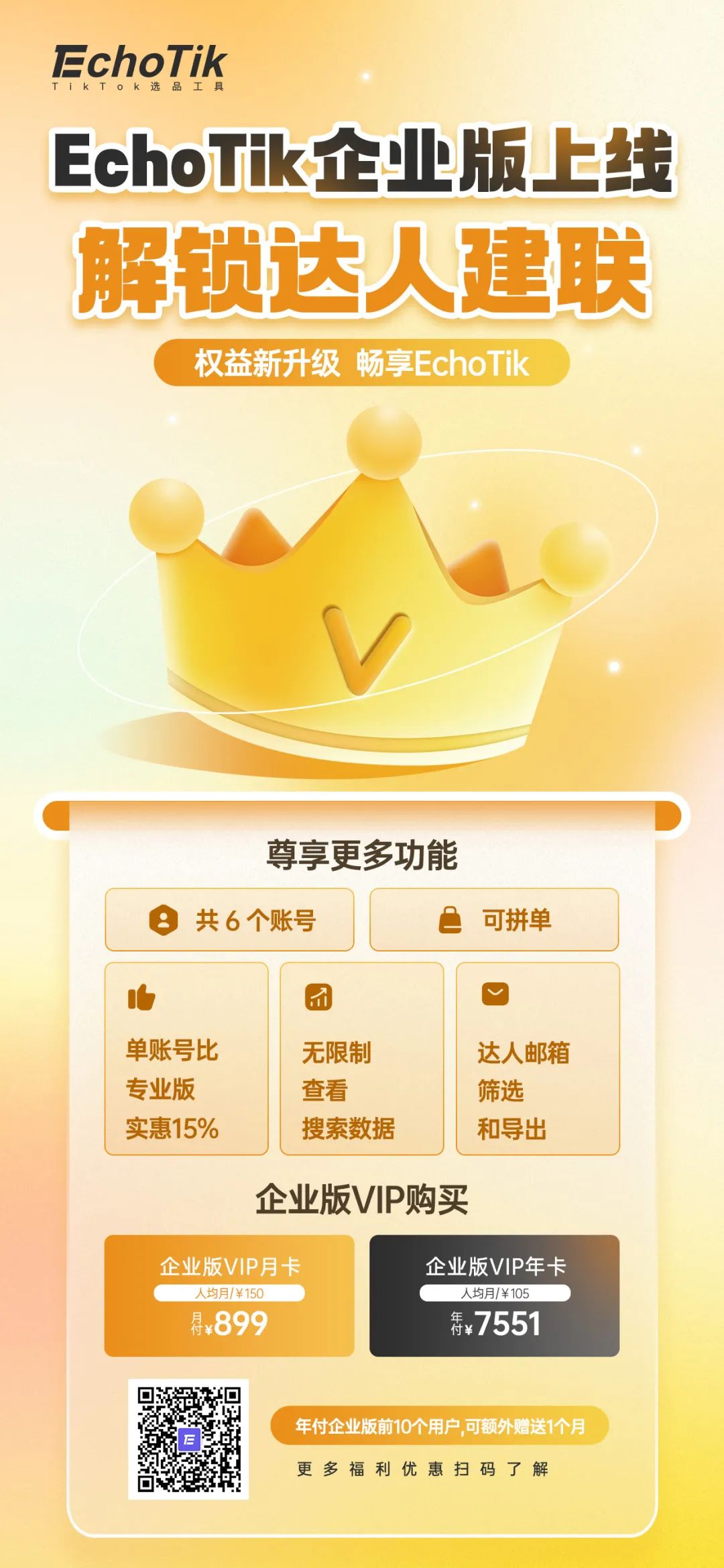 插播一个好消息:EchoTik 【企业版】重磅上线!具体权益如下图海报,报名【年付企业版前10个用户】 可额外赠送1个月!