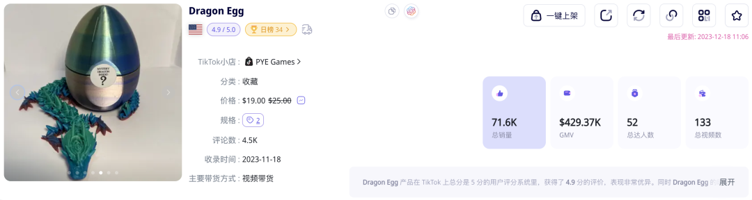 在近30天收藏类GMV排名Top 1的就是这款3D打印的「彩色龙蛋+龙」玩具组合。单品总销量达到7.16万,截至12月18日,预估GMV达到了近43万美元!产品获得了4.9分的评价,表现非常优异。