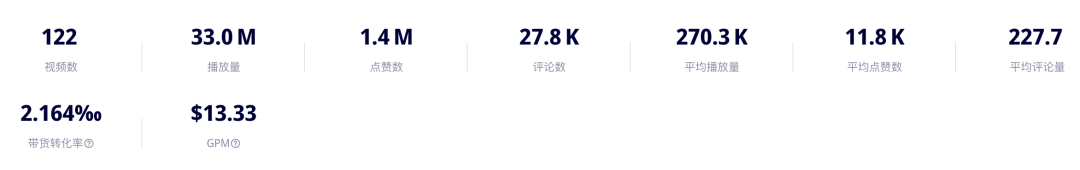 商品主要通过达人短视频带货,辅助直播带货。商品上架以来共产出51条短视频,参与直播11场,共带来3300万曝光,预估GPM(每千次视频观看成交额)高达13.33美元。