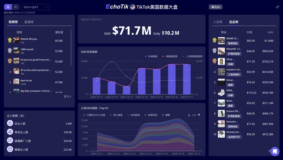 TikTok Shop美国电商数据周榜(12/11-12/17)已出,具体信息如下: