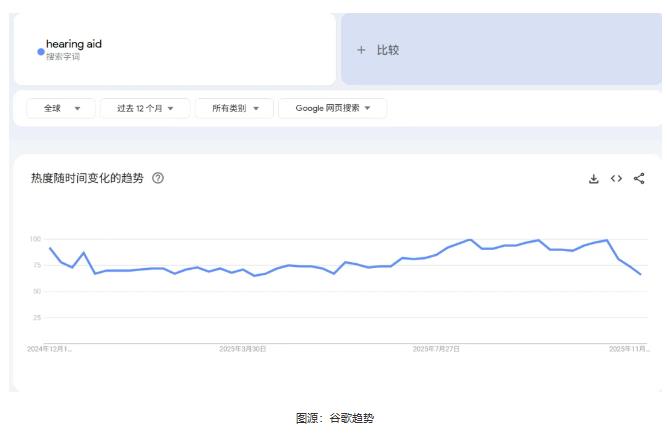 谷歌趋势数据显示,过去一年,“hearing aid(助听器)”一词全球范围内搜索热度持续在65—100之间,热度一直处于高位。