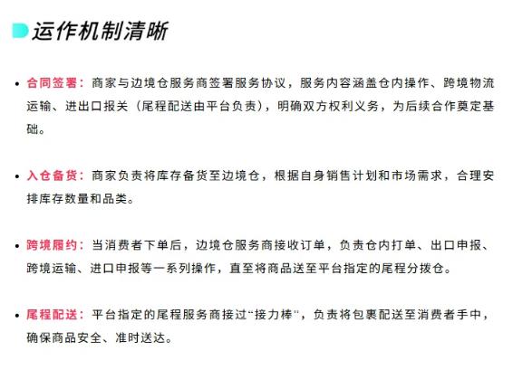 据了解,3PL边境仓运作模式为:商家先与边境仓服务商签署涵盖仓内操作、跨境运输、进出口报关(尾程配送由平台负责)的服务协议,再根据销售计划将库存备货至边境仓;消费者下单后,服务商承接仓内打单、出口申报、跨境运输、进口申报等流程,将商品送至平台指定尾程分拨仓,最终由平台尾程服务商完成配送。