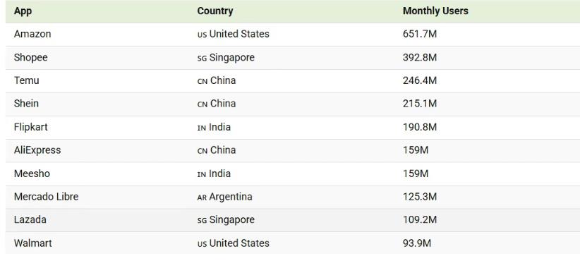 根据Similarweb最新数据,2025年全球前十大电商App月活跃用户数合计已突破20亿。Temu以2.464亿月活用户位居第三,仅落后于亚马逊和Shopee。